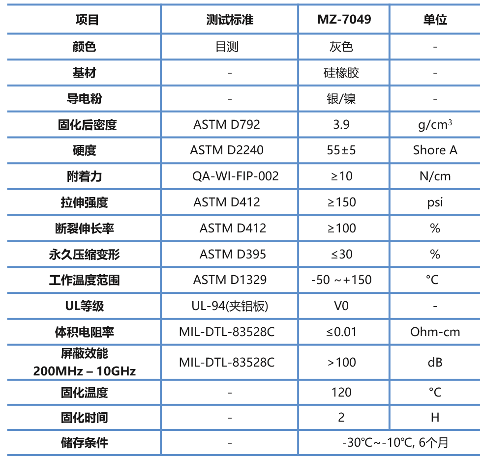 MZ-7049 是一款以银包镍填充单组份硅弹体形式的高温硫化导电胶水,具有良好的压缩性和优异的导电性,且在各种金属及塑胶表面有着很好的粘接性,适合应用电信基站、光模块、汽车电子、汽车雷达、手持终端和消费电子EMI 点胶成型.