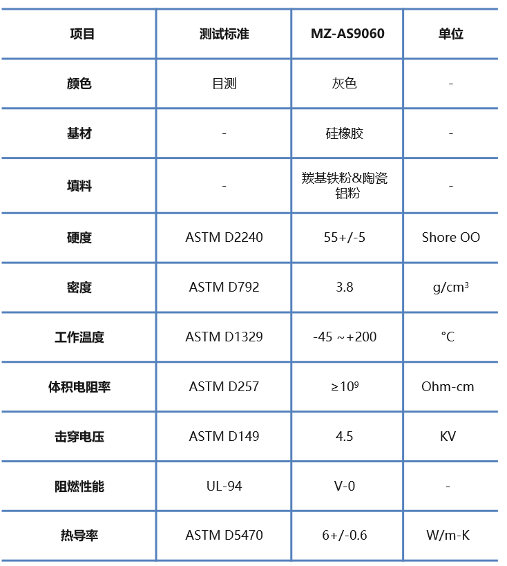 MZ-AS系列导热吸波材料,兼具吸波和导热双重功能,以高分子硅胶为基材,添加各种吸波粉体和助剂制成的复合材料。产品在较低压力下就可实现低界面热阻和吸收电磁波的功能,且有良好的绝缘耐压和环境稳定性,置于热源/电磁波辐射源和散热器之间,进行热传导的同时吸收电磁波。特别适合光通信领域中光电传输模块的应用.MZ-AS9060系列的导热系数可达6W,可帮助设计工程师同时解决源自特定组件或电路板的EMI兼容性和热管理问题。