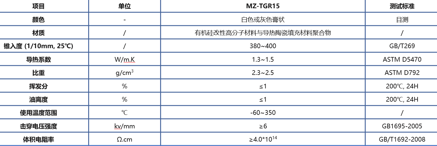 MZ-TGR15热硅脂采用进口原料配方生产,使用导热性和绝缘性良好的金属氧化物与有机硅聚合物复合而成的经特殊工艺加工而成的膏脂状物。产品具有良好的导热性和电绝缘性,较宽的使用温度(工作温度-60℃~+350℃),很好的使用稳定性,较低的稠度和良好的施工性能。具有导热、耐更高温及低温、不干涸的特点.
